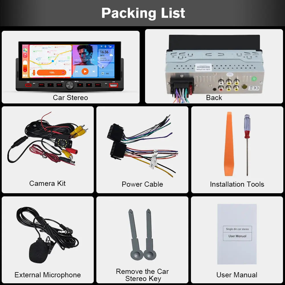 - ćUniversal Single DIN Touchscreen Car Stereoć This single din touchscreen radio features a high-resolution 6.86-inch display, designed to fit most vehicles with a standard single DIN radio slot (180 x 50 mm). Its compact build ensures a seamless dashboard installation. Please note: use the included power adapter during installation to prevent battery drain or other electrical issues.