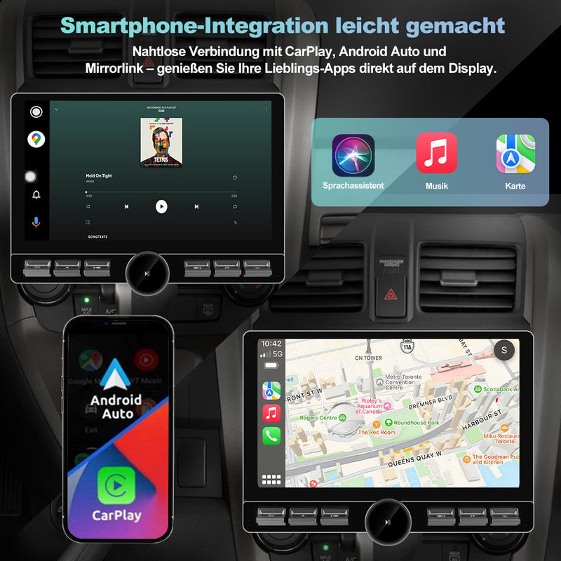 【Carplay und Android Auto】Dieses Autoradio unterstützt sowohl CarPlay als auch Android Auto, um Ihr Smartphone nahtlos mit dem Fahrzeug zu verbinden. Mit CarPlay und Android Auto können Sie Ihre bevorzugten Apps, Navigation, Musik und Nachrichten direkt auf dem großen Touchscreen des Autoradios nutzen