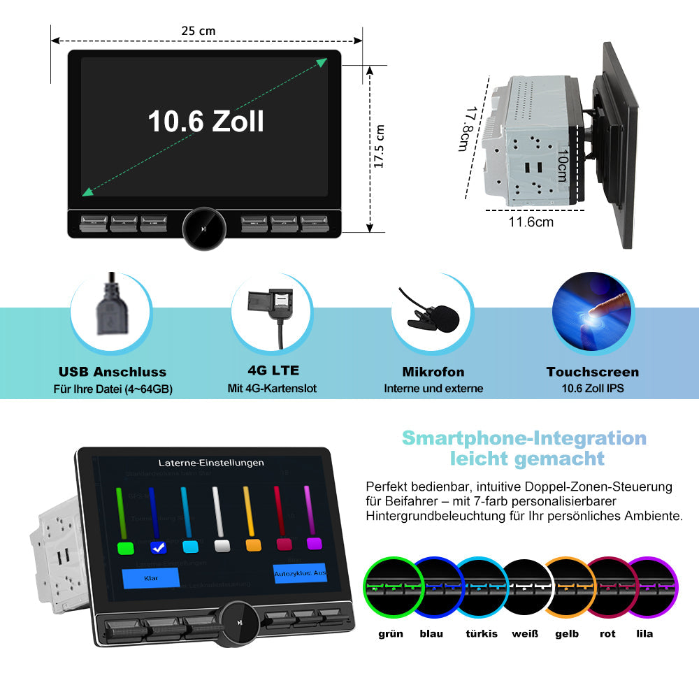AWESAFE Android 13 2 DIN Autoradio 10,6-Zoll Touchscreen 8-Kern 4+64GB mit 4G-SIM-Steckplatz (ohne SIM-Karte), Bluetooth, WLAN, kabellos CarPlay & Android Auto