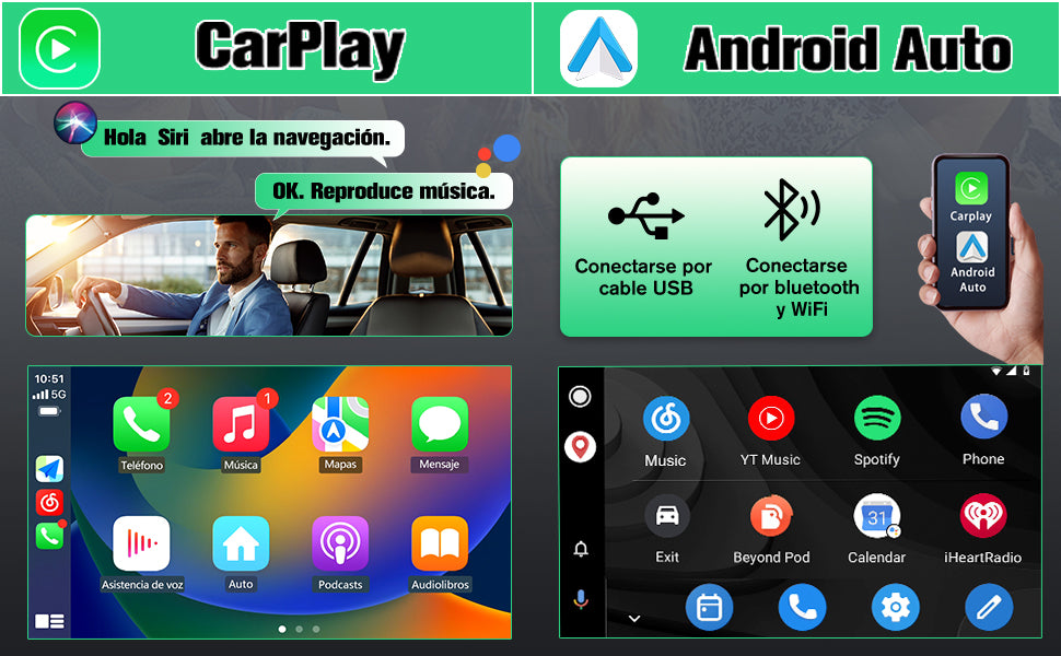 - 🚗【Carplay/Android Auto inalámbrico】La radio lleva Carplay y Android Auto incorporado. Puede conectarlos tanto inalámbricamente por Bluetooth y WiFi, como por cable USB(es necesario conectarlo al cable USB 4 pines de la radio). No necesita comprar adaptadores para usar estas dos funciones. Con las dos funciones puede usar el asistente de voz inteligente o toque la pantalla para obtener direcciones, hacer llamadas, enviar y recibir mensajes y disfrutar de la música, etc.