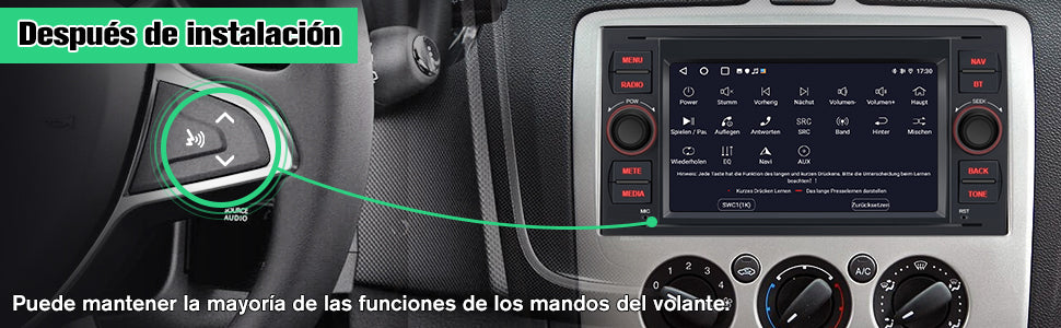 - 🚗【Manos libres y mandos del volante】Puede controlar el multimedia por varias vías: la pantalla táctil sensible/botones básicos en el panel/mandos del volante(mantiene la mayoría de los mandos originales de su coche). Pero no admite el comando de voz. También puede escuchar música o hacer llamadas con el manos libres por Bluetooth(sirve para todos los teléfonos Android y iOS). Si cree que la voz es baja, puede conectar el micrófono externo del paquete.
