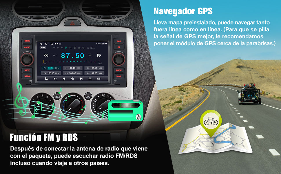 - 🚗【Disfruta de su viaje con reproductor de multimedia】1. Apoya la reproducción de multimedia por Bluetooth, USB,etc. 2. Puede sintonizar la radio por FM/RDS. 3. Tiene memoria de RAM 2GB y ROM 32 GB y admite WiFi, puede escuchar música o ver vídeo tanto en línea por Wifi como fuera de línea. 4. Puede conectar su Smartphone Android o iPhone a la radio a través del cable USB 4 pines para usar la función Mirror Link, con que puede escuchar música o ver videos de su móvil directamente por la radio.