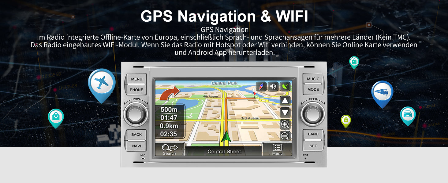 - 【Navigation】Das Autoradio bietet eine umfangreiche Navigationsfunktion. Sie können zwischen Online- und Offline-Navigation wählen, je nach Ihren Bedürfnissen. Das Autoradio verfügt über integrierte Offline-Karten von verschiedenen Regionen, einschließlich Europa, mit mehreren Sprachoptionen. Wenn das Autoradio mit dem Hotspot Ihres Mobiltelefons verbunden ist, können Sie die Vorteile der Online-Karten nutzen. Sie können Ihr Ziel eingeben und das Autoradio wird Ihnen die beste Route anzeigen.