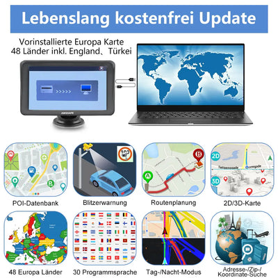 【Lebenslang Update Karte】Der Navigator ist mit Karten von 48 Ländern in Europa vorinstalliert, die sofort nach Erhalt des Geräts verwendet werden können. Das Navi unterstützt 29 europäische Sprache, die Anzeige in Kilometern/Metern, Meilen/Fuß/Yards, 2D/3D-Karte.Support client : Contactez le vendeur pour assistance ou téléchargement des mises à jour.