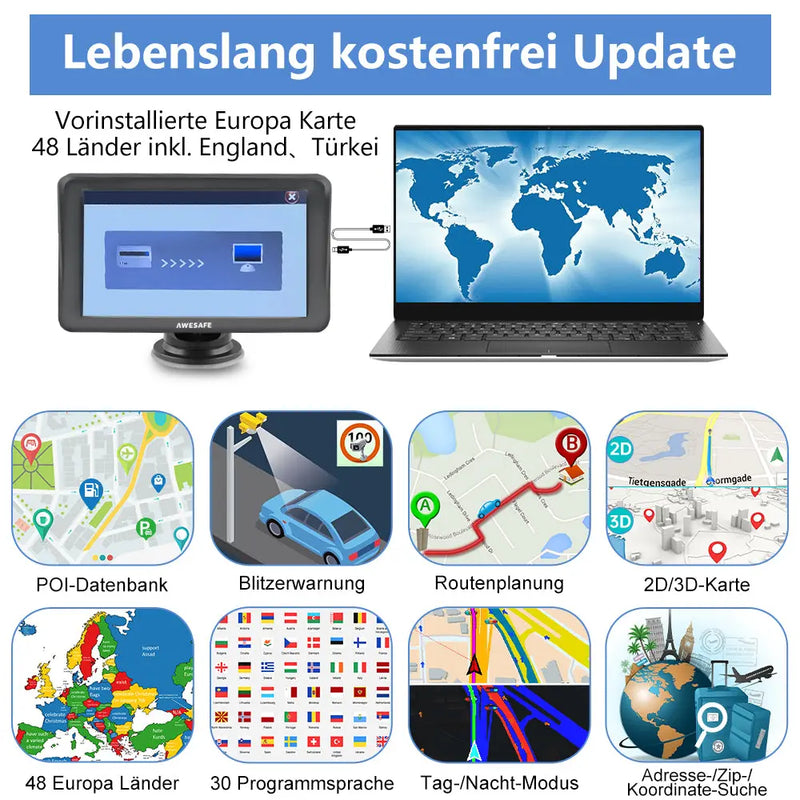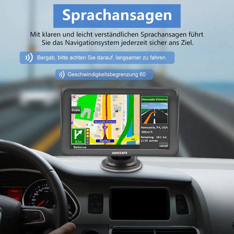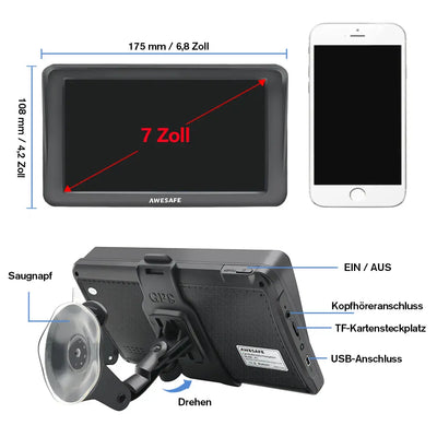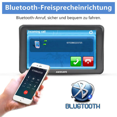 【Multifunktionales Navigationsgerät】AWESAFE Navigation unterstützt Bluetooth-Konnektivität, Routenführung, Sprachansagen (kein TMC), Anzeige von Verkehrszeichen, Warnung vor Geschwindigkeits- und Höhenbeschränkungen vor fest installierten Radarkameras und Speichern bevorzugter Routen